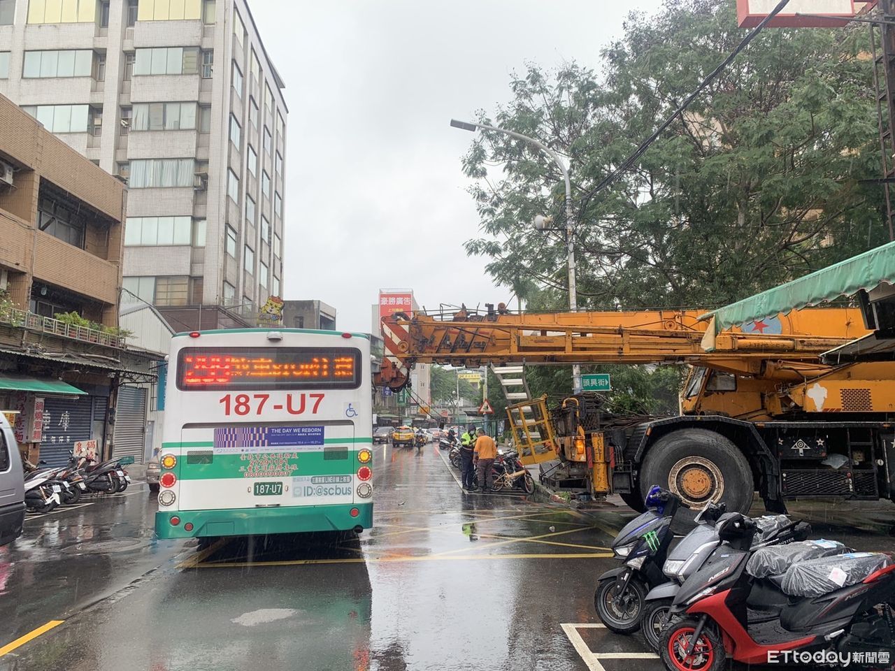 據了解,當時53歲的葉姓男子,開著工程吊臂車要駛出頭興街口準備右轉化成路,剛好一輛三重客運經過,58歲蔡姓駕駛看到吊臂閃躲不及發生擦撞,公車頭右上方毀損,車上乘客也嚇一大跳。