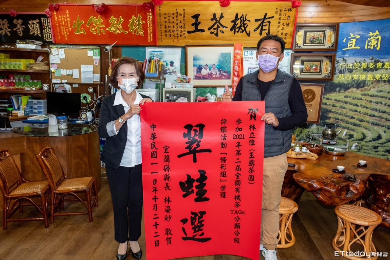 ▲宜蘭縣長林姿妙祝賀林立偉,奪全國有機茶「條形組」翠蛙選殊榮。(圖/記者游芳男翻攝,下同)