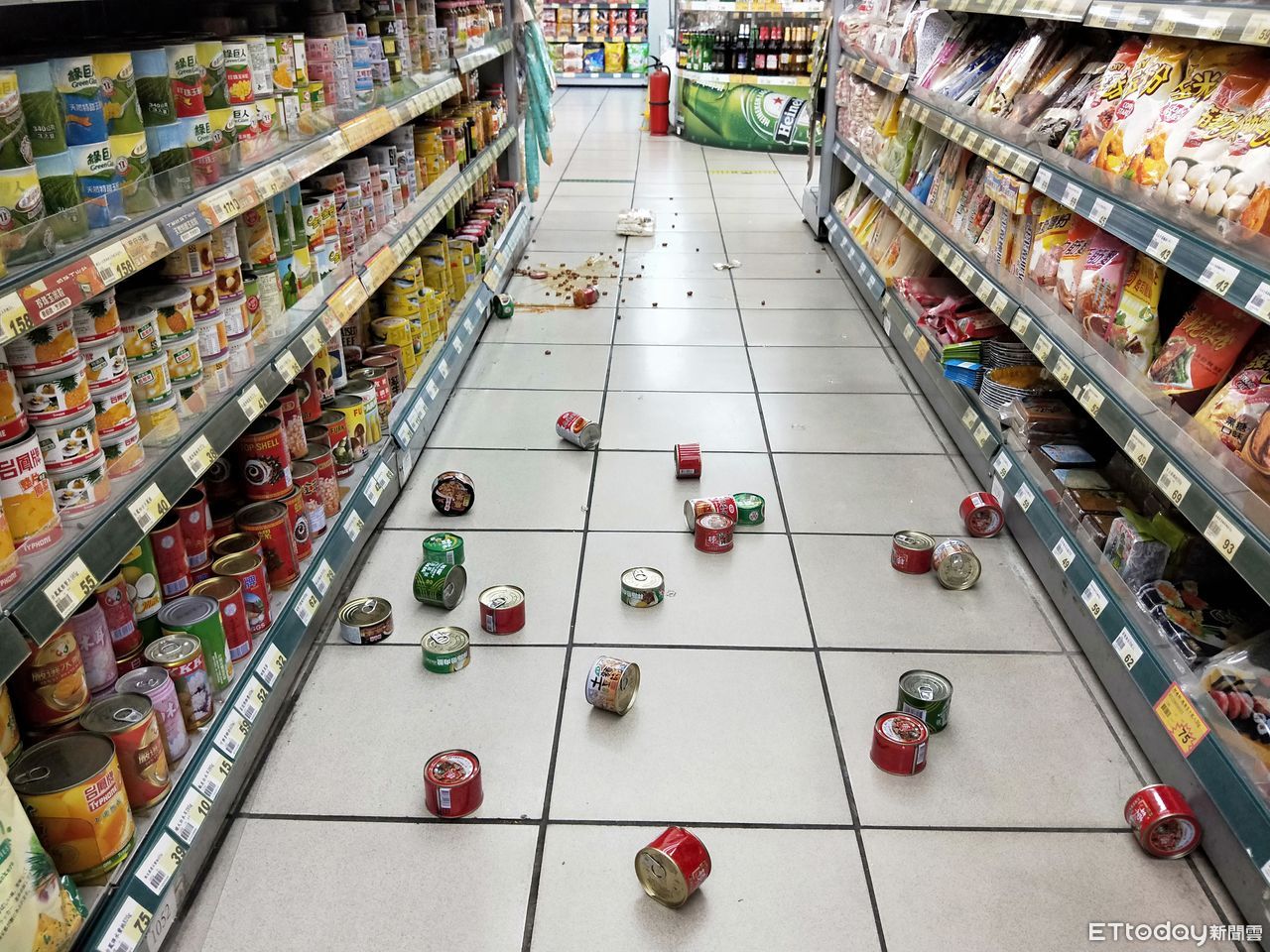 ▲地震襲宜蘭,生鮮超商架上貨品應聲搖落地。(圖/記者游芳男攝,下同)