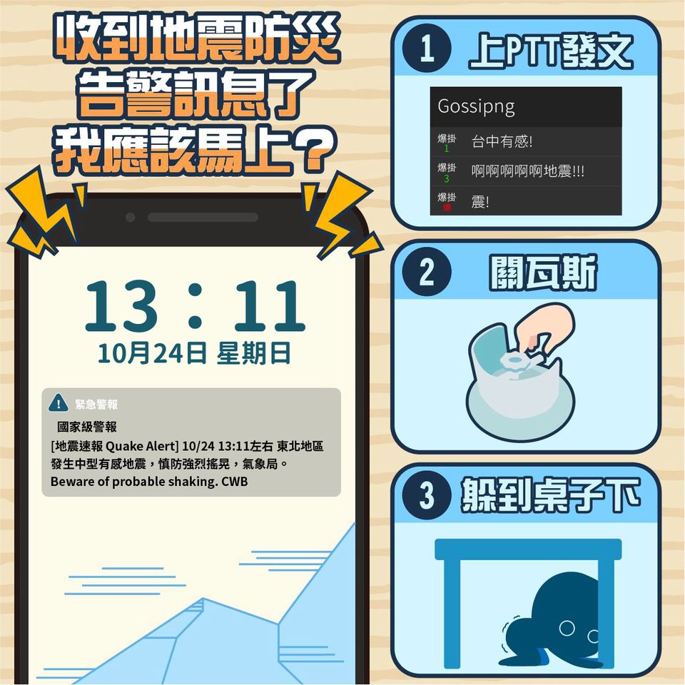 ▲氣象局表示,上ptt 發文,不如保護自己的頭頸部。(圖/翻攝「報地震-中央氣象局」臉書粉專)