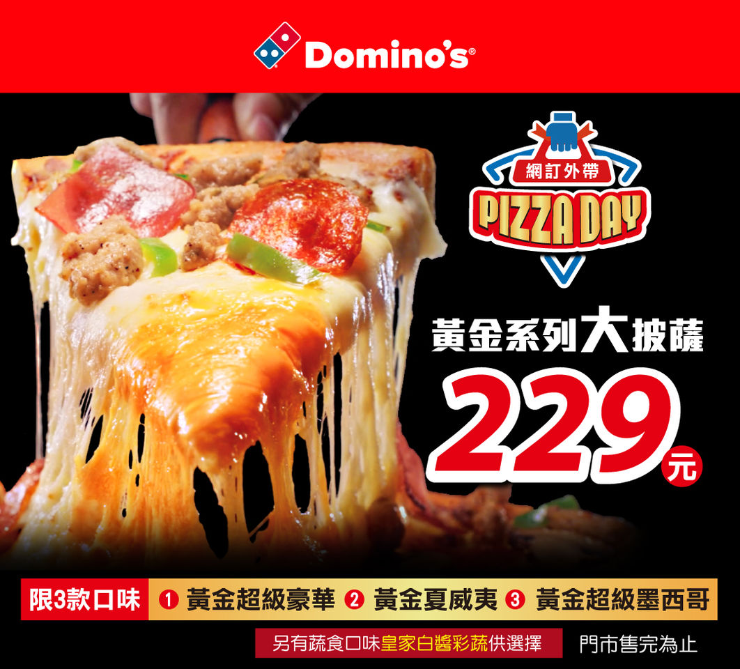 達美樂黃金巧達系列披薩,採用3款香濃起司,使用莫札瑞拉起司絲、巧達起司及莫札瑞拉起司條,高溫烘烤,交疊出風味濃郁的層次,每一口都能享用到高品質、熱呼呼的三重起司美味。週二限定的特惠披薩,消費者可至達美樂官網或APP訂購,需至門市外帶,每家門市限量販售,售完為止。