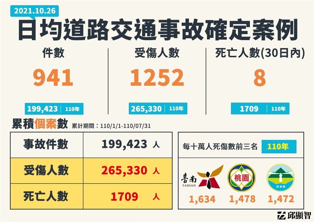 時代力量黨團幹事長王婉諭指出,2020年台灣有3000多人死於交通事故,將近50萬人在道路上受傷,而2021年截至7月為止,已經有1709人死於交通事故,更有26.5萬人因事故受傷,不難發現3年將近1萬人的死亡數,早已遠遠超過我國因新冠肺炎死亡的人數。