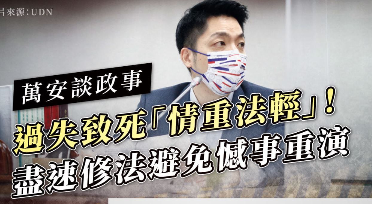 蔣萬安表示,從八仙塵爆、太魯閣號列車出軌,到前些日子發生的城中城大火,接連的重大公安事故,造成好幾個家庭破碎,也讓社會各界不斷質疑、檢討,過失致死的刑度是否真的太輕了。