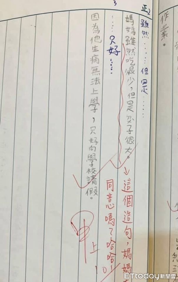 吳婦女兒日前在造句作業本上寫上「媽媽雖然吃很少,但是肚子很大。」老師雖然在作業本上反問:「這個造句媽媽有同意嗎?哈哈!」卻還是給了女兒甲上的成績,不禁讓她大嘆「媽媽真的不好當」。