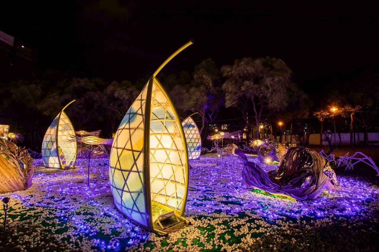 ▲「Lima島嶼海洋」在黑夜裡散發溫暖黃、藍光芒。(圖/新竹市政府提供)