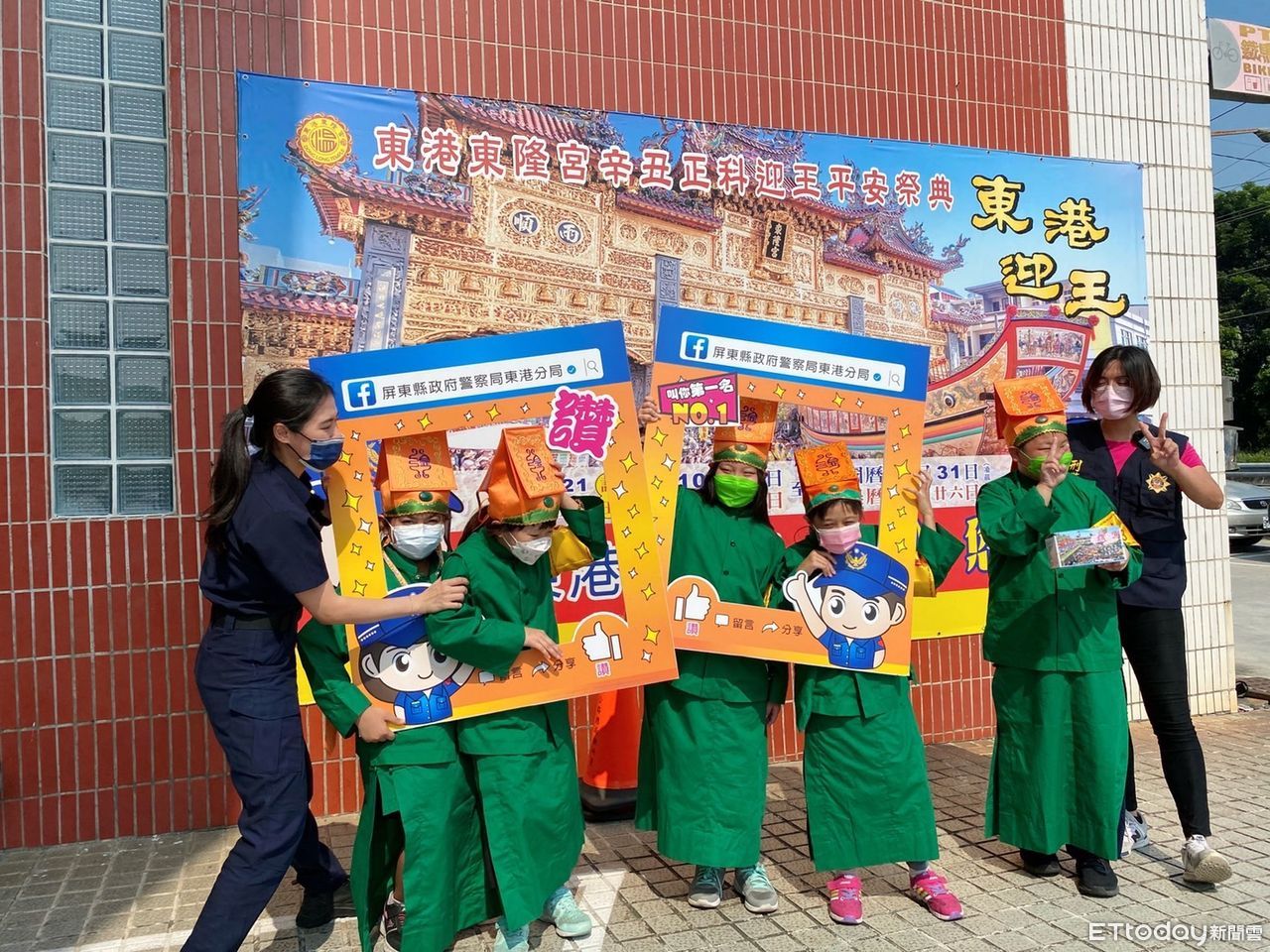 3年一科屏東迎王辛丑正科東港迎王平安祭典今(27)日進入第4天中區遶境,各陣頭隊伍行經東港警分局並進入「勞警」,吸引信眾圍觀,警方利用機會灌輸正確交安、預防犯罪的法律觀念,同時免費送「一整盒」限定版口罩,提醒信眾參與祭典要確實遵守防疫規定,讓信眾稱讚東港警方的貼心、用心,紛紛拍照打卡索取。