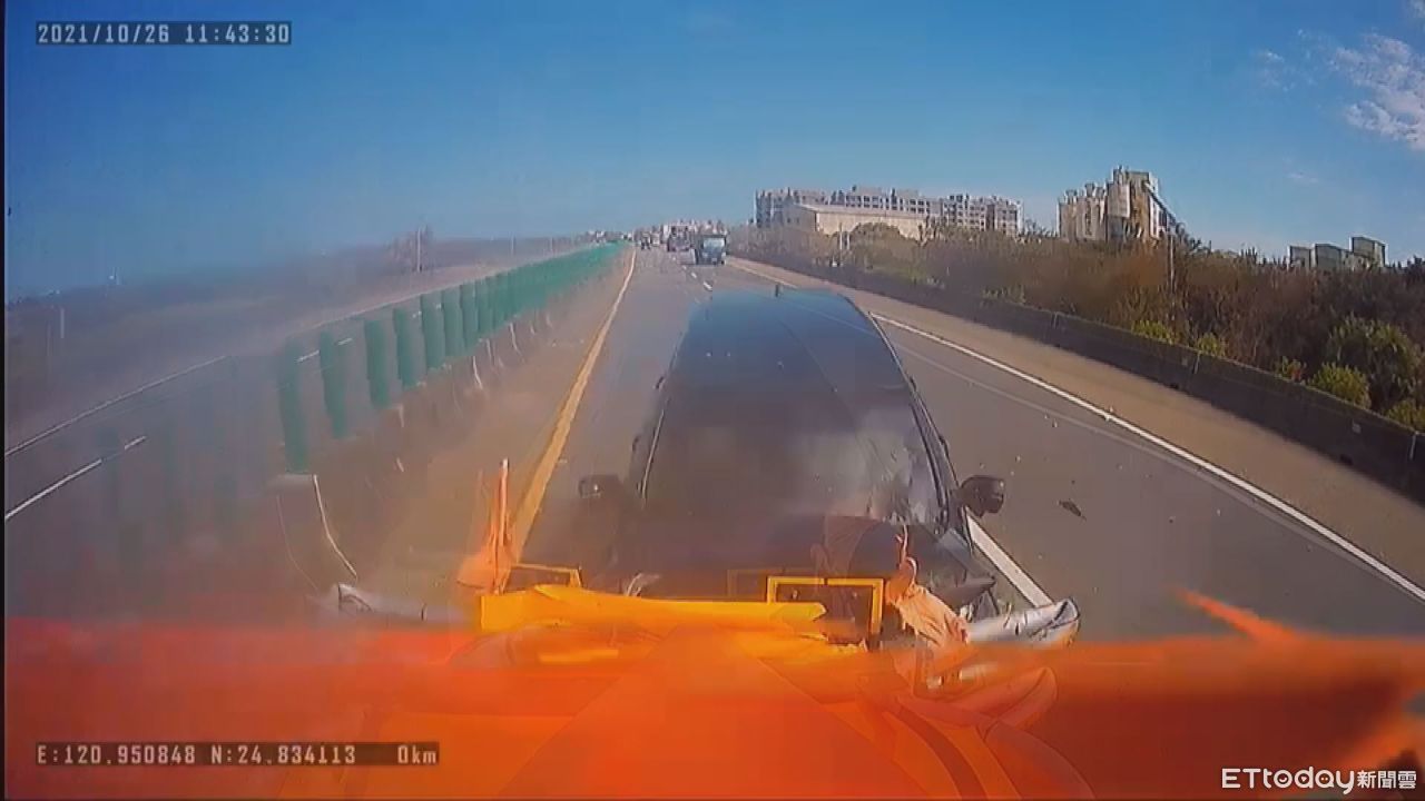 據行車記錄器顯示,當時台68線往東8.7公里處內側車道停著黃色防撞車,上面還插著紅色旗幟警示,經過的大車、小車、機車全都切換到外側車道行駛,但這輛休旅車似乎沒有發現前方車況,完全沒有減速下,直接從後方撞上防撞車,整輛車彈起橫跨2車道,車頭全毀零件也散落一地,後方車輛見狀也減速慢行。