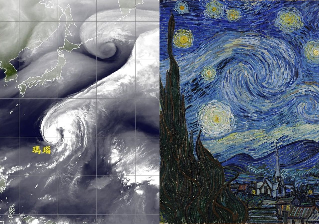 瑪瑙颱風持續往日本東方海域前進,由於距離台灣較遠,不會直接影響台灣天氣。氣象局長鄭明典27日在臉書分享一張瑪瑙颱風的衛星雲圖,其他網友看了紛紛驚呼「颱風浮世繪」、「有浮世繪的感覺」,也有人覺得「像梵谷的星空」。