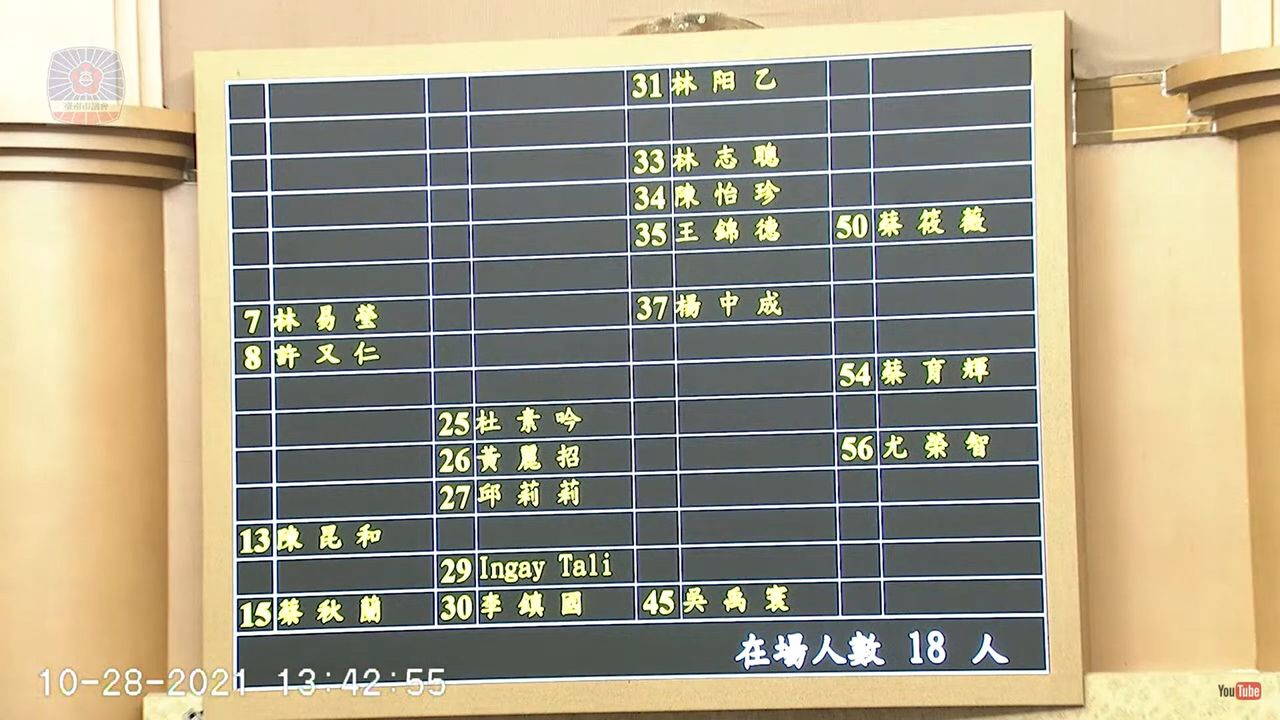 另外,文中還附上一張議員簽到名單,只見到場的有林易瑩、許又仁、陳昆和、蔡秋蘭、杜素吟、黃麗招、邱莉莉、Ingay Tali、李鎮國、林阳乙、林志聰、陳怡珍、王錦德、楊中成、吳禹寰、蔡筱薇、蔡育輝、尤榮智,共18人。但總席次為56人,等於缺席38人。