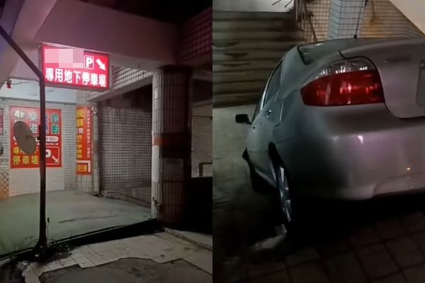 想進停車場,卻不小心開錯車道!高雄一名男子外出訪友,準備將車輛駛入地下停車場,卻疑似看錯牌子、開錯車道,導致整輛車45度卡在樓梯上,離譜的畫面讓人看了傻眼,直呼「這下吃力了」。