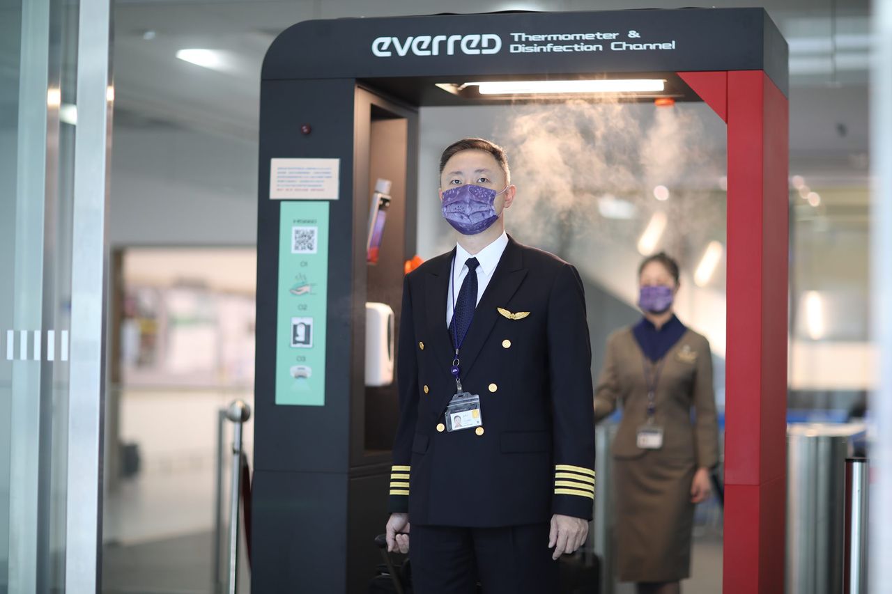華航777總機師盧希文憶起去年3月,他被指派飛第1班往返上海的專機,接回滯留在武漢的台商,當天,他穿上全套防護裝備,回台後飛機直接被拖到棚廠內,由化學兵對下機的每一個人進行消毒,「那是我第一次穿防護衣,戴N95口罩和護目鏡,穿上去以後就不能脫下來,即便機上溫度調到18度,還是全身從頭濕到腳,臉上是各種壓痕。」沒想到,後來這樣的裝備成為機組員的飛行日常。