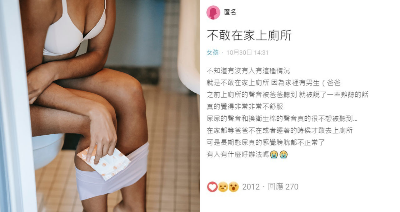 「不知道有沒有人有這種情況?」有一名女網友昨(30日)在網路論壇發文表示,自己就是不敢在家上廁所,因為家裡有男生(爸爸),之前上廁所的聲音被爸爸聽到,就被說了一些難聽的話,真的覺得非常非常不舒服,尿尿的聲音和換衛生棉的聲音真的很不想被聽到,在家都等爸爸不在或者睡著的時侯才敢去上廁所,可是長期憋尿真的感覺膀胱都不正常了,無奈詢問,「有人有什麼好辦法嗎?」
