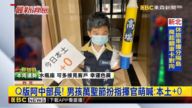 一年一度萬聖節到來,許多家長也幫孩子們盛裝打扮。台北一名曾姓媽媽認為中央流行疫情指揮中心指揮官陳時中在防疫非常辛苦,刻意幫兒子畫了黑眼圈,手拿高端疫苗跟+0圖卡,去學校參加活動。當被問到萬聖節經點語句「不給糖會怎樣?」,孩子也興奮地微笑說,「不給糖就打高端!」