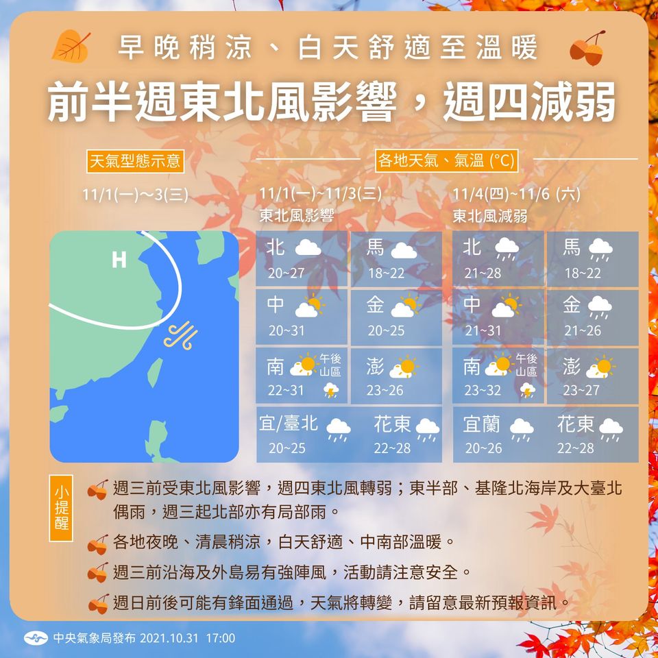 中央氣象局表示,未來一週天氣將有2段式變化,這周二、周三(11月2日、3日),東北風影響,基隆北海岸、東半部地區及大台北山區有局部短暫雨,大台北平地也偶有零星降雨,其他地區為多雲到晴,午後山區有零星短暫陣雨;由於3日華南水氣東移,水氣略增,北部地區亦有局部短暫雨;氣溫上,迎風面感受較涼,其他地區溫暖舒適。