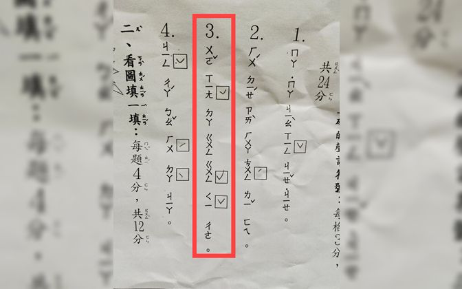文章曝光後,底下網友狂噴笑,「我想打公公騎車」、「鄉音很重的老杯杯吧:我想達拱拱起車」、「外省腔沒錯啊」、「呵呵,真的台灣ㄍㄡˊㄧˇ」、「應該是山東爺爺奶奶帶大的孩子」、「還有第四題呀!警察保護大家…注音也錯啦」、「真的...看整張都注音會有障礙,直接自己比小孩糟糕」、「我唸完差點被自己噎死」。