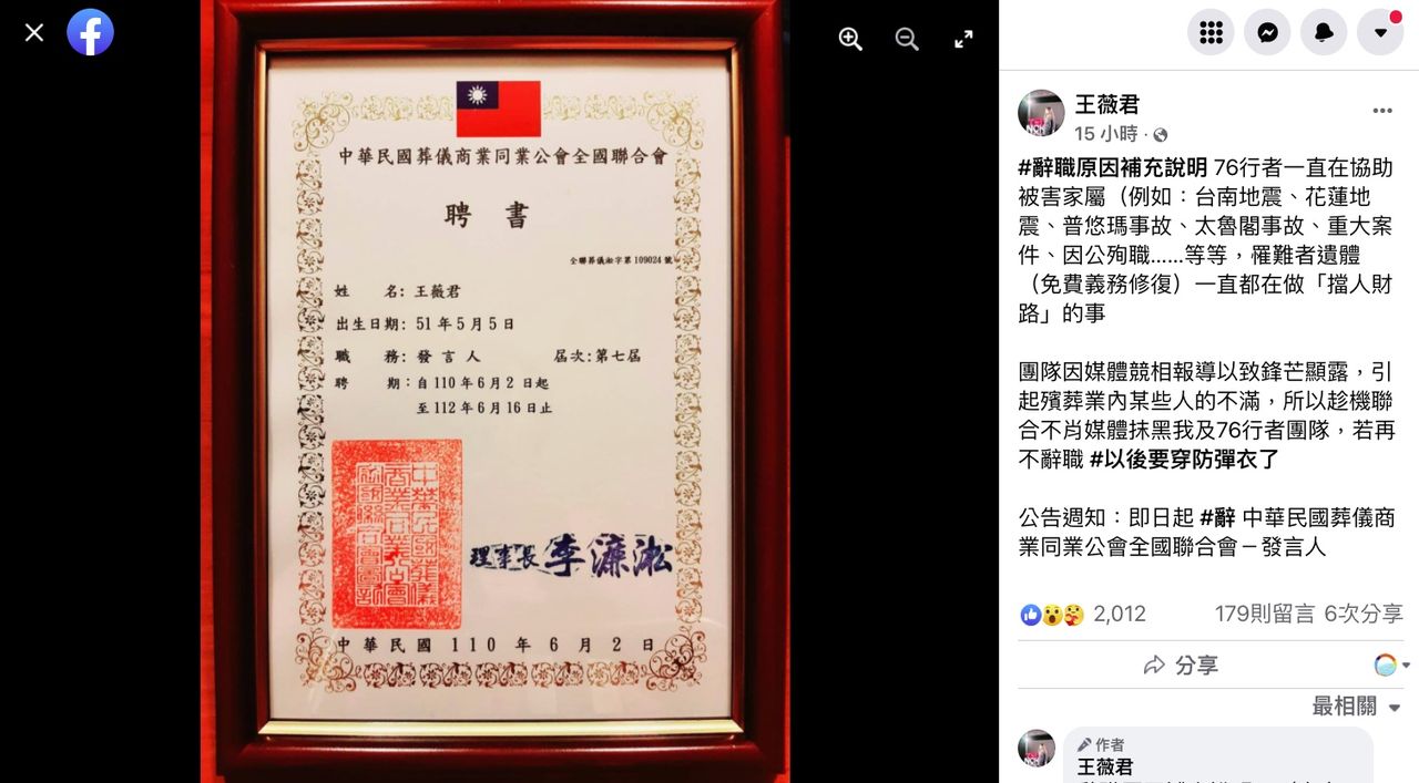 王薇君3日在臉書上寫道「76行者一直在協助被害家屬(例如:台南地震、花蓮地震、普悠瑪事故、太魯閣事故、重大案件、因公殉職等等,罹難者遺體(免費義務修復)一直都在做「擋人財路」的事。」