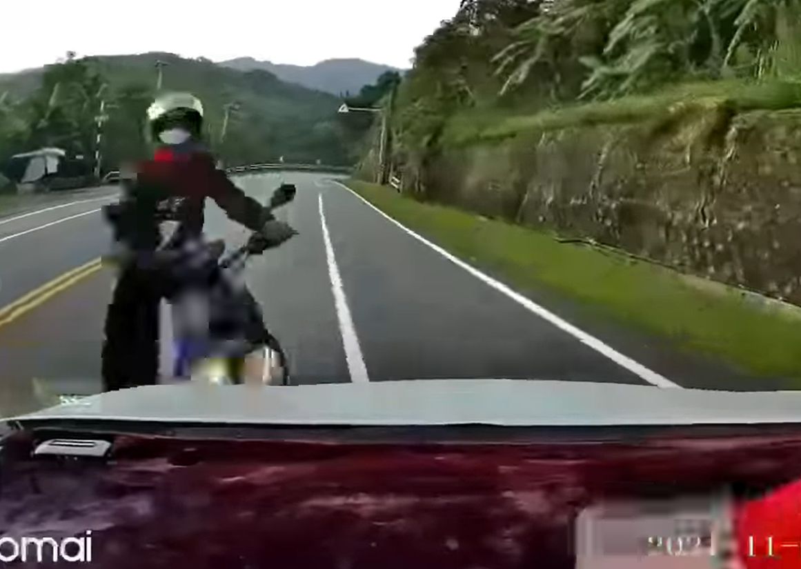 該段白車的行車紀錄器被網友PO在臉書社團「爆廢公社公開版」,以「他下次還會嗎?猴子騎車,翹孤輪」為影片下註。影片顯示,白車行駛途中,機車先翹孤輪,隨後疑似失控衝向白車,當場連人帶車撞上轎車頭部,副駕女乘客也嚇到尖叫,男駕駛則無奈地嘆了口氣說,「唉,我車門打不開了」。