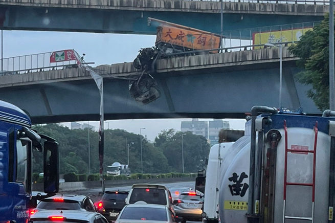 突發中心/綜合報導 今(8日)早國一彰化系統出口北上方向,發生一輛大貨車自撞路邊護欄,結果車頭懸掛在橋樑邊,造成該路段嚴重回堵長達2公里。▲國一彰化系統出口北上方向貨車自撞。(圖/翻攝記者爆料網)