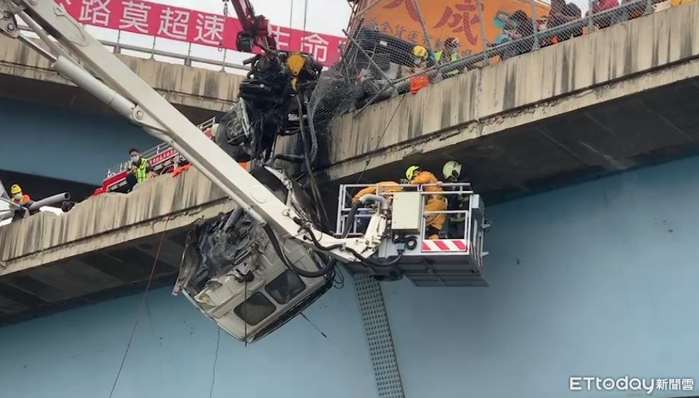 ▲貨車車頭懸空,警消出動雲梯車救援。(圖/民眾提供)