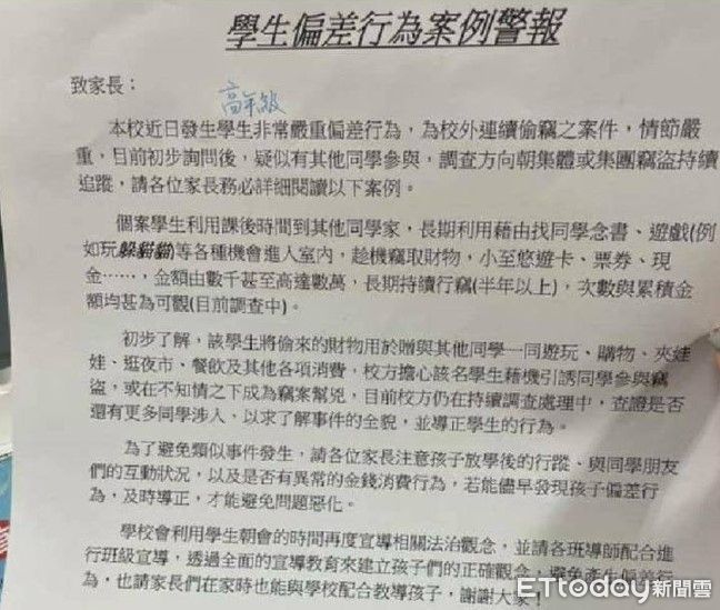 ▲校方向家長寄發「學生偏差行為案例警報」。(圖/翻攝大台中生活網)