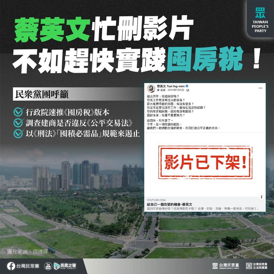 總統蔡英文在2012年首次參戰總統時推出一支競選短片,反問民眾買得起房子嗎?受得了油價、泡麵、奶粉等一直漲嗎?接著再強調,給蔡英文一個改變台灣的機會,並呼籲投票日實現公平正義。但近日網友卻發現YouTube上這支影片悄悄轉為不公開,讓原先嵌入該則影片的臉書文湧入許多人留言開酸。對此,民眾黨12日轟,與其虛心刪影片,不如快點兌現囤房稅支票。