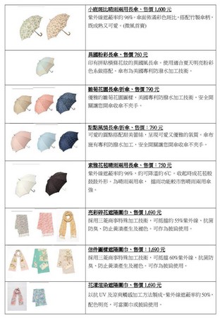 陰晴不定的梅雨季到來,雨具成為外出必備用品。生活雜貨業者也推出系列產品,搭配碎花、水玉、小鹿斑比等設計元素,打造出多款折傘、長傘等新品,兼具防曬和擋雨功能,另外也有推出防曬圍巾、兒童遮陽等產品,整體售價從480元到2760元不等。