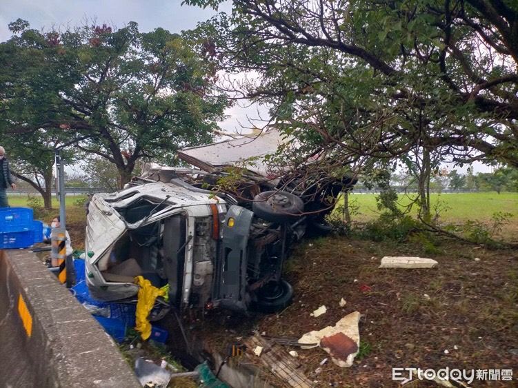 ▲國道3號南投名間交流道出口匝道大貨車翻覆。(圖/記者高堂堯翻攝,下同)