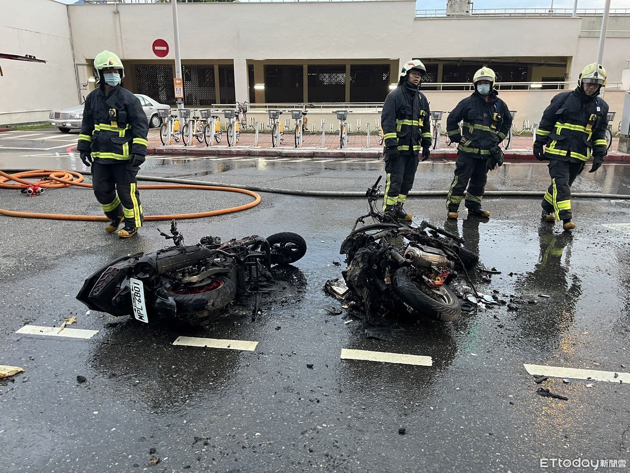 ▼警消佈水線滅火,2機車燒到只剩下骨架 。(圖/記者陳以昇翻攝,下同)