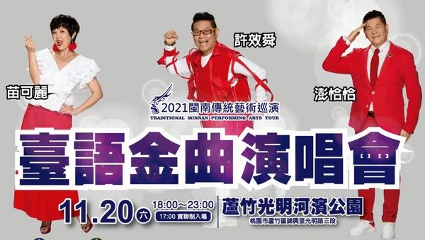 受疫情影響,桃園閩南文化節系列活動今年無法舉行,延期至明年的6至7月舉辦,唯第四年舉辦的閩南傳統藝術巡演活動「2021臺語金曲演唱會」,如期舉行, 11月20日晚間6點於蘆竹區光明河濱公園盛大開唱!邀請市民朋友一同來到現場,要用好歌聲和好音樂,陪伴民眾渡過美好的時光。