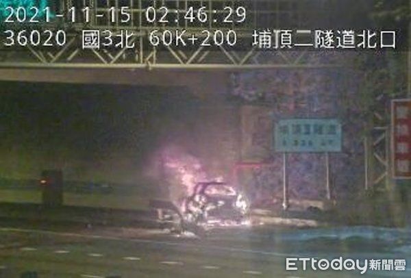 國道三號15日凌晨2時許,一輛轎車行經南下60.1公里處時,疑似失控撞上埔頂2號隧道口的護欄,車頭在撞擊後起火,熊熊火勢迅速吞沒整輛車。警消獲報到場,發現駕駛已自行脫困下車避難,無人受困傷亡,於是拉出水線射水灌救,但整輛車仍被燒成廢鐵。由於該起事故,該路段部分車道一度封閉進行灌救,事故原因有待調查釐清。