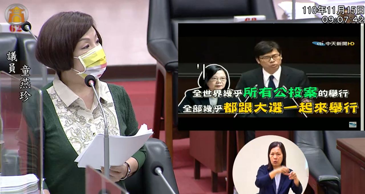 高雄市議員童燕珍今天在市議會質詢時,播放陳其邁擔任立委談及公投綁大選議題的影片,當時他聲稱「國民黨將公投綁大選視為毒蛇猛獸,殊不知全世界幾乎所有公投案的舉行,都跟大選一起來舉行」,質疑陳其邁態度雙標,並稱播放影片是希望能夠喚起市長愛民的初衷,不要把公投視為洪水猛獸,更不要把自己說的話遺忘了,凡走過必留下痕跡,這都是無法抹滅的。
