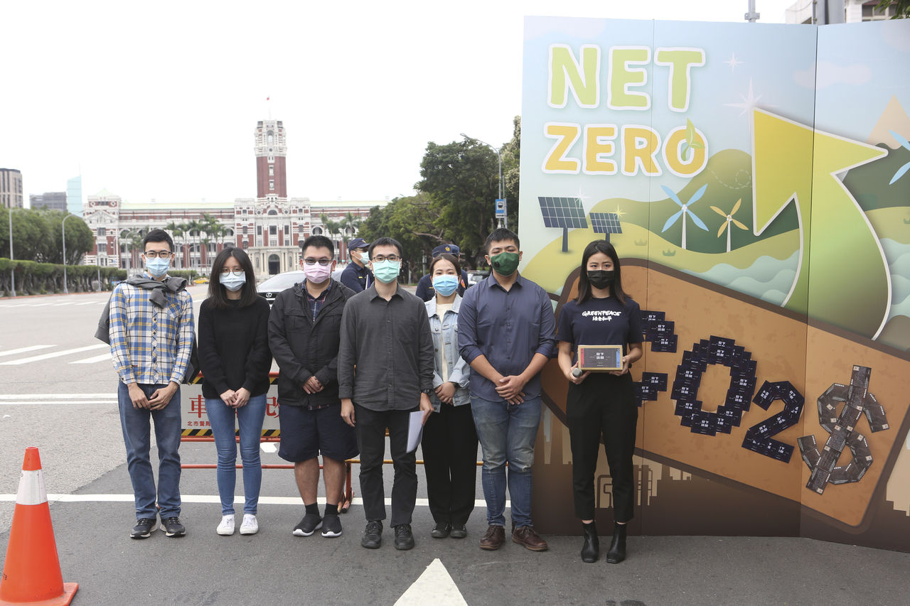 綠色和平今(15日)和台灣青年永續發展協會TYSDA、台大氣候行動社的代表前往總統府前,帶著巨大的淨零之路集願板,與COP26期間蒐集來超過300張來自民眾的明信片,喊話總統蔡英文、行政院長蘇貞昌,「缺乏有效的碳定價,淨零就不可能發生。」