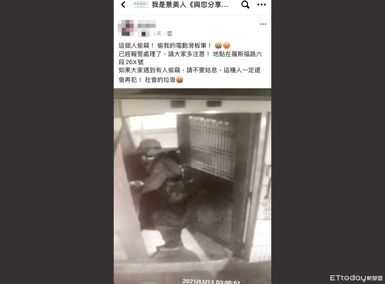 被害人事後將監視器畫面上傳臉書社群示警;劉姓女被害人表示,「這個人偷竊!偷我的電動滑板車!已經報警處理了」、「請不要姑息、這種人會再犯!社會的垃圾!」。畫面顯示,歹徒身穿深色上衣長褲,頭戴漁夫帽遮蔽臉孔。