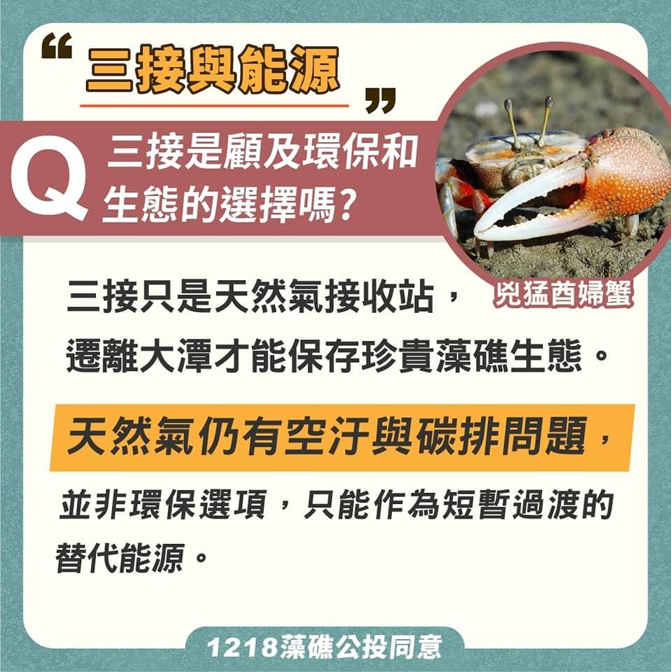 三接只是天然氣接收站,遷離大潭才能保存珍貴藻礁生態。天然氣仍有空汙與碳排問題,並非環保選項,只能作為短暫過渡的替代能源。