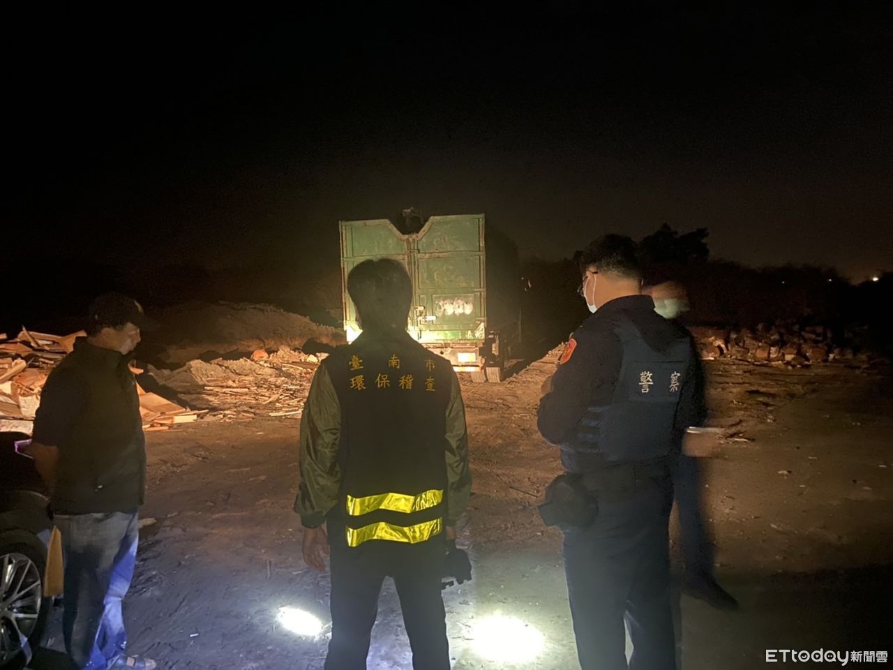 ▲台南市環保局及台南市警三分局土城派出所,16日凌晨2時許聯手查獲不肖人士,摸黑於漁塭傾倒裝潢廢棄物。(圖/記者林悅翻攝,下同)