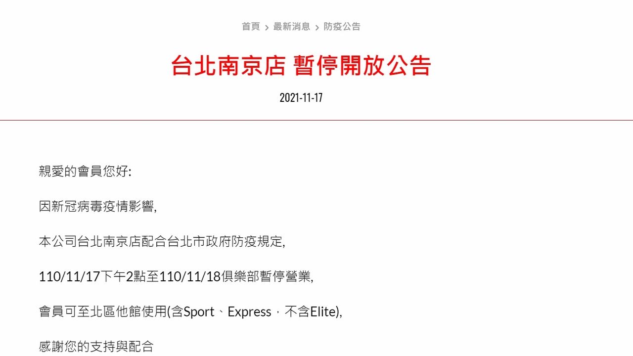 World Gym健身房官網稍早貼出緊急公告指出,台北南京店配合北市府防疫規定,11月17日下午2點至11月18日俱樂部暫停營業。