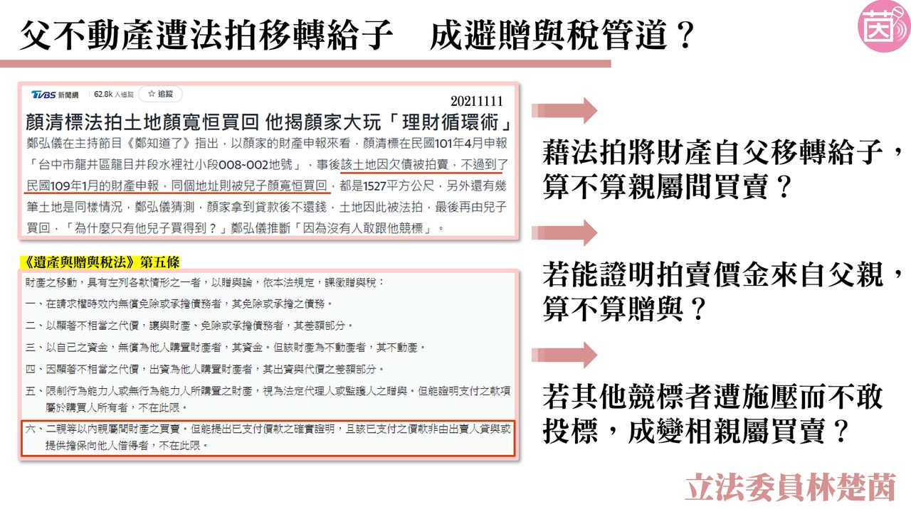 林楚茵批評,根據遺贈稅法第5條,除非資金可確認不是來自賣方,否則二親等內的親屬間財產買賣視同贈與。若資產遭法拍、父親提供資金給兒子競標,再藉地方勢力使其他人不敢出手,是否形同變相逃避贈與稅?