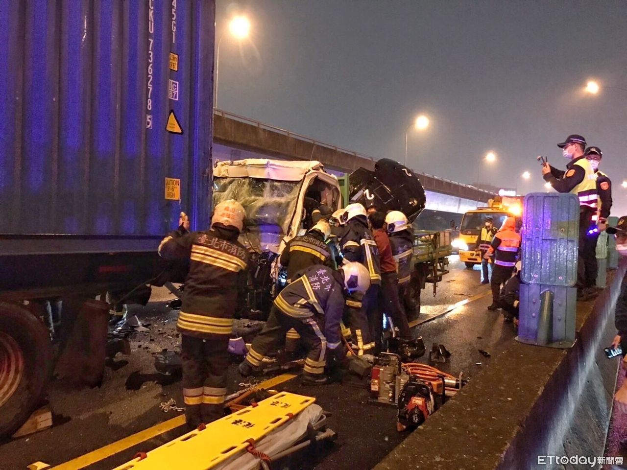 國道警方18日傍晚接獲報案,立即派員趕抵現場,發現2部大車、1部小車發生追撞,而且撞擊力道猛烈,其中以大貨車損毀最為嚴重,車內41歲賴姓駕駛、33歲曾姓副駕駛遭夾受困,傷重失去意識。消防到場後,立刻封鎖南北雙向各一線車道救人,但2人被救出時,已明顯死亡。