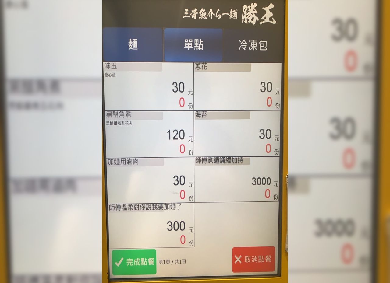 而從勝王的新公告的菜單可見,新增的2個新品分別是「師傅煮麵誦經加持3000元」、「師傅溫柔對你說我要加麵了300元」。勝王也在留言區表示,「我也不是那麼雞X真的都不知道改進,我們做生意有改進、有進步。」