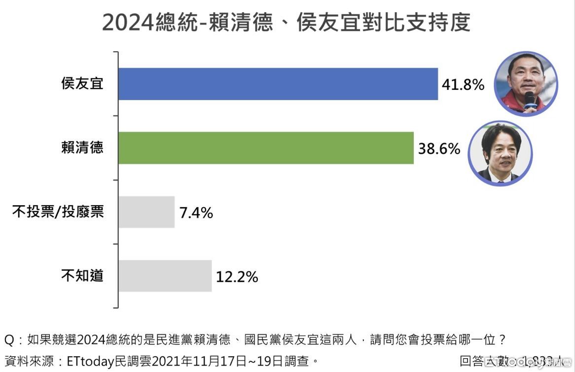 根據《ETtoday新聞雲》最新民調顯示,2024總統選戰,藍綠若由侯友宜對決賴清德,侯友宜以支持度41.8%微幅領先賴清德的38.6%,但若加入民眾黨柯文哲,侯友宜的支持者將被柯文哲瓜分,變成賴清德以35.5%的支持度,稍稍領先侯友宜的30.3%。