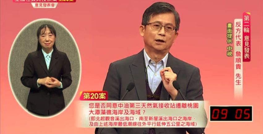 反方提到,不管原方案或外推還是會破壞,詹順貴反問,所指的生態系範圍到哪?至於又會有怎樣影響, 「不敢說沒有」,但擔憂的是不同環保價值,一起放在同個天平上衡量兼顧。詹順貴強調,萬一該公投通過,對藻礁可能會有擔憂,但未必會發生。