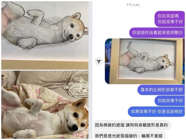 工作室則表示,因為原PO提供的照片中,狗的身軀有被棉被遮檔,才會導致軀體變形,「我們是透光紙張描繪的,輪廓不會錯」,「以妳照片的提供,我們已盡量繪製」,「妳的照片有遮擋加模糊,我無法畫得和其他照片一樣,如果您不滿意很抱歉,我們也沒有詐騙」。