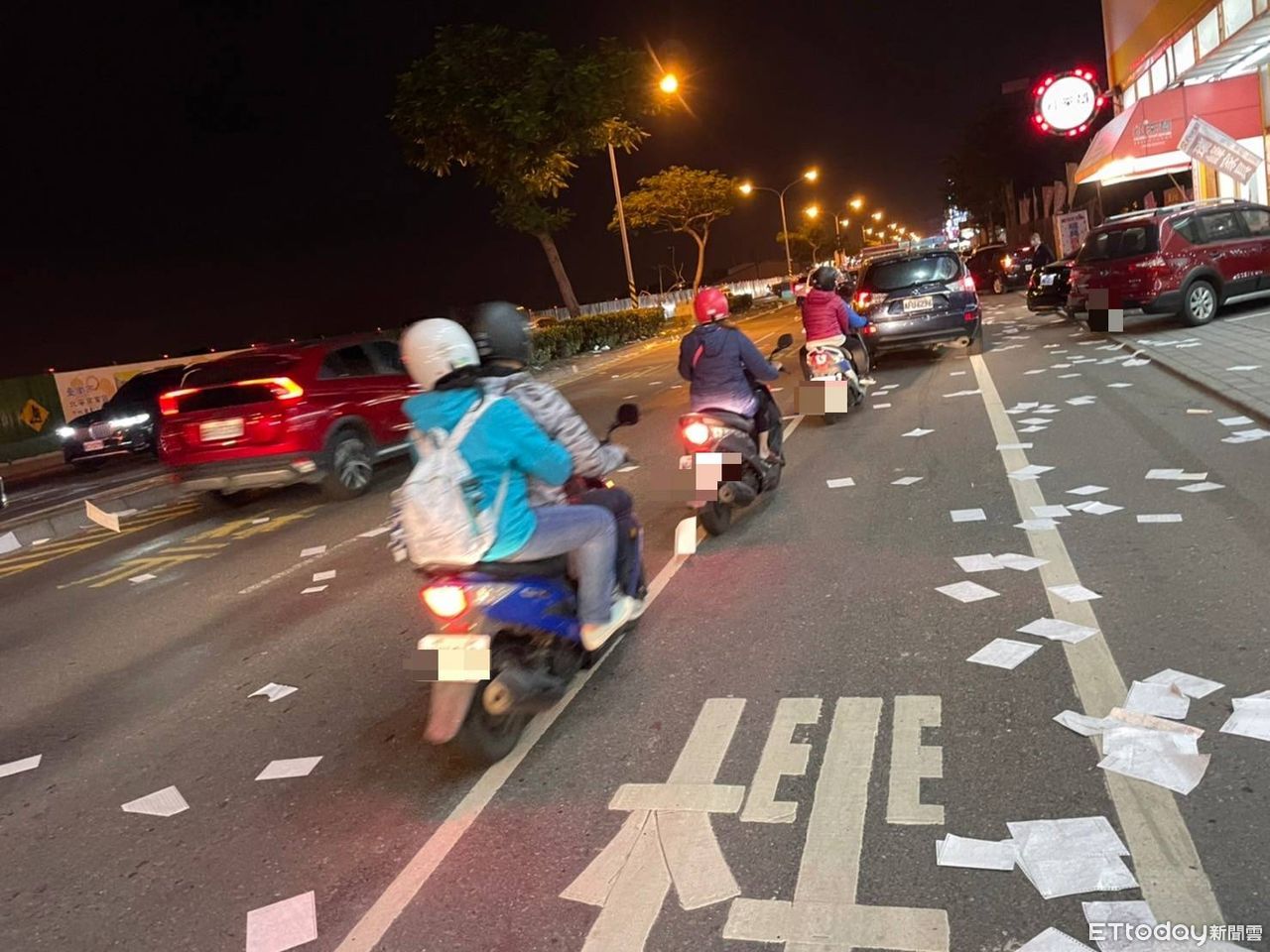 ▲安南區北安路段上四處散落日曆半成品紙張,並從安通路延伸至慈安路口都有,警方立即實施交通疏導,並通報環保局協助清理。(圖/記者林悅翻攝,下同)
