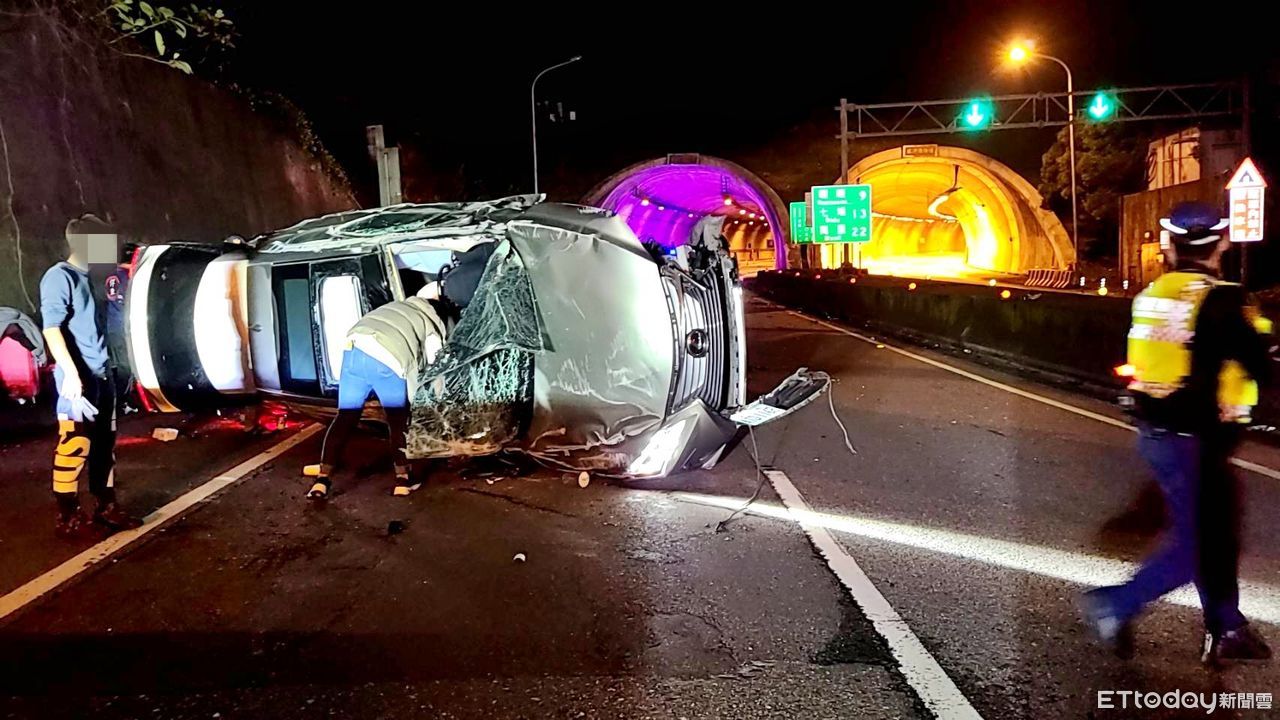 ▲台62萬瑞快速道路自撞分隔島,車子側翻90度「立車」路中。(圖/記者郭世賢翻攝)