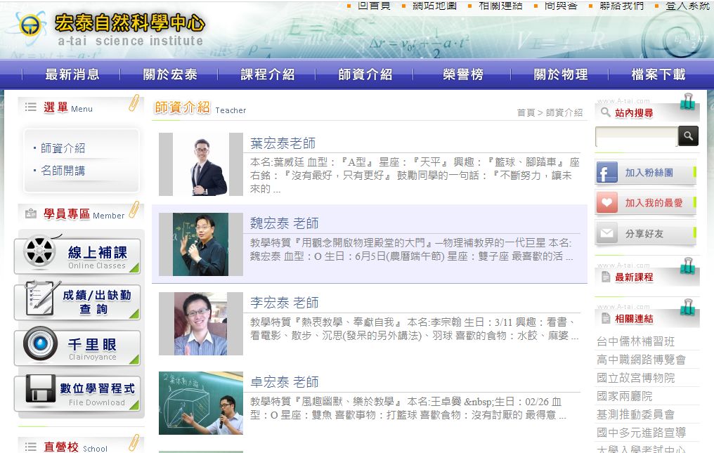 該補習班網頁顯示,師資介紹部分有7名「宏泰」老師,分別姓氏為「葉」、「魏」、「李」、「卓」、「王」、「鍾」、「蔡」;此外,點進去個人業面會有血型、星座、興趣、座右銘及鼓勵同學的一句話,值得注意的是某些老師寫有本名。