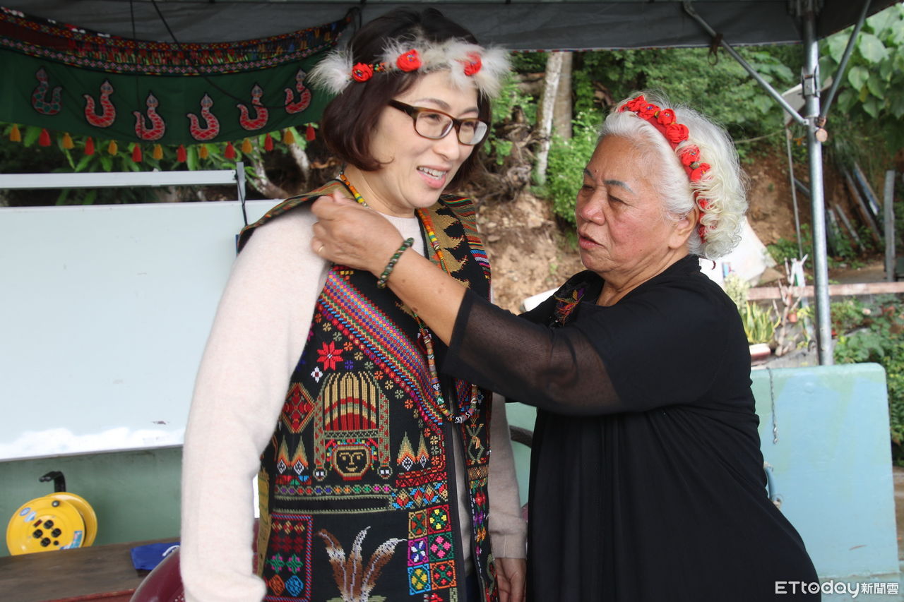 ▲陳利友妹(右)向饒慶鈴說明背心圖騰意涵。(圖/記者楊漢聲翻攝)