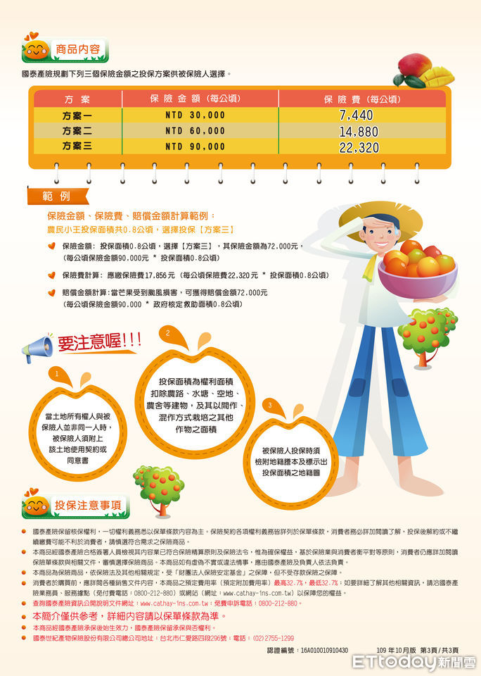 為彌補颱風、豪雨、寒害、高溫(焚風)或霪雨等5大天災造成的果農損失,確保農民所得安定,農委會與國泰世紀產物保險股份有限公司推出110年「國泰產物芒果農作物保險(政府災助連結型)」,當芒果因上述5種天然災害受損,損害程度達政府現金救助標準時,就可以同時獲得保險理賠。