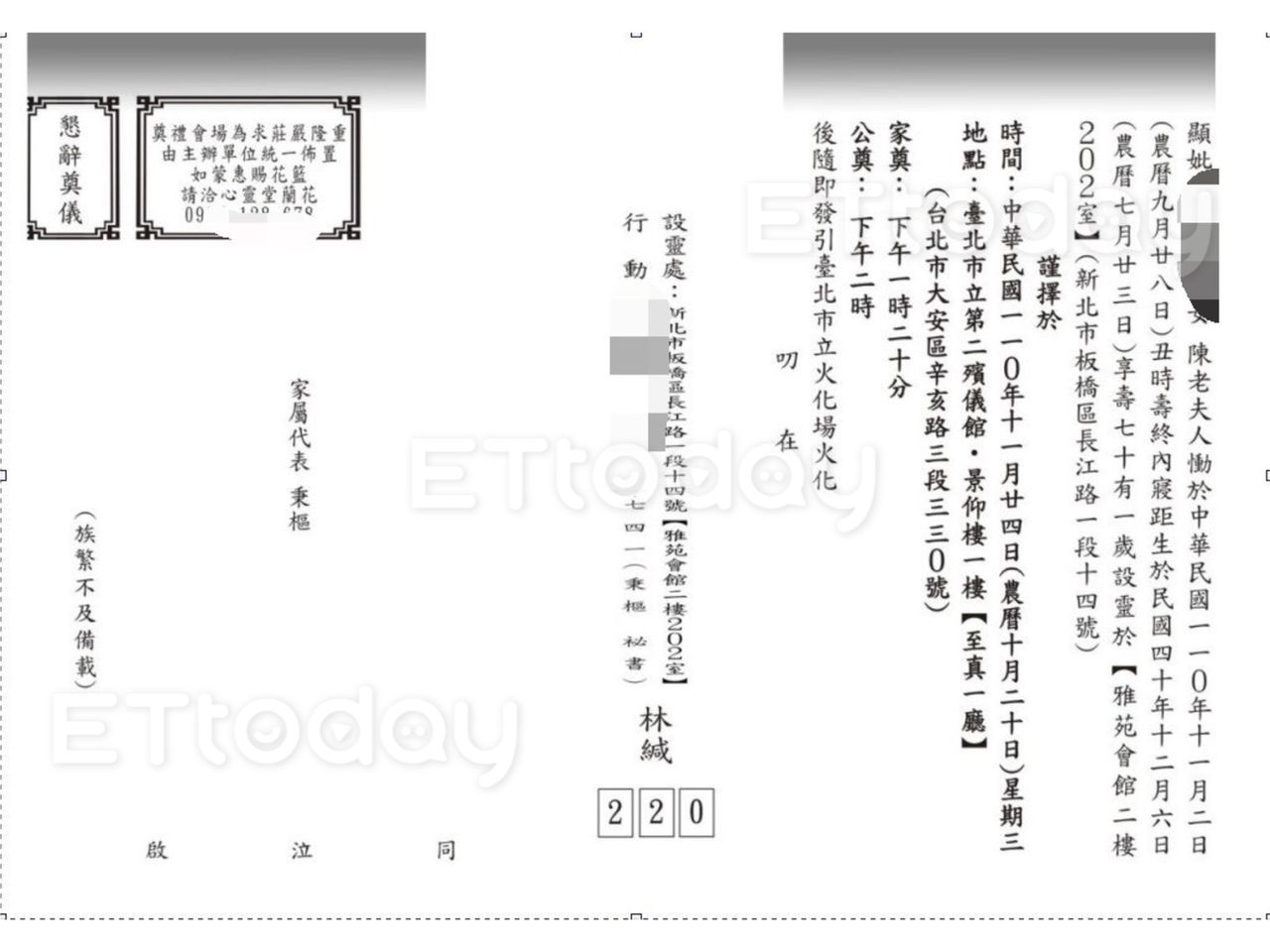 ▲林秉樞母喪時,向總統府申請輓聯時提供的訃聞,家屬欄位僅登載1人。(圖/讀者提供)
