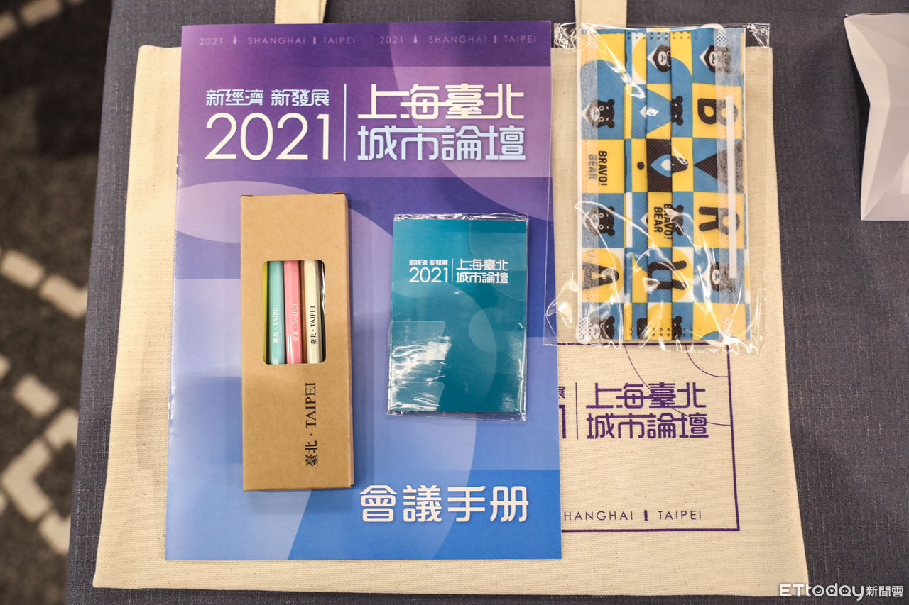 ▲2021台北上海雙城論壇,貴賓禮物包含悠遊卡、帆布袋、口罩等。(圖/記者林敬旻攝)