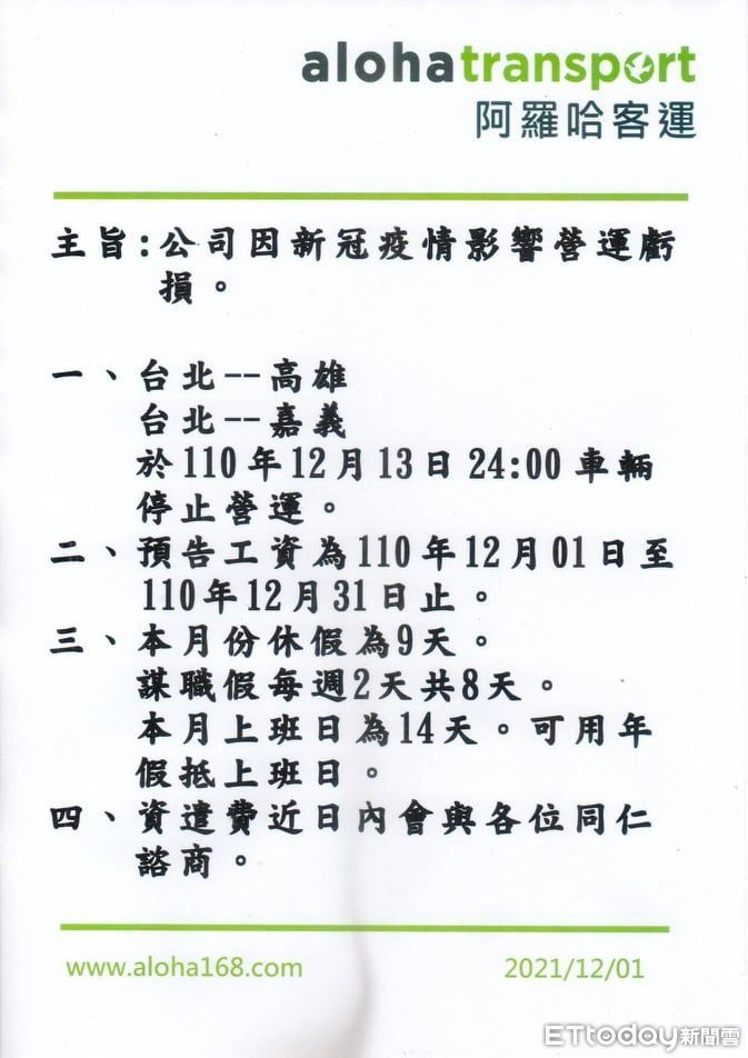 阿羅哈客運受疫情影響,於昨日對內發布公告,預計將於12月13日停止營運僅存的台北至嘉義、台北至高雄路線,停止營運後變形同全面停止營運。對此,阿羅哈客運內部尚無回應。公路總局則表示,阿羅哈客運預計於明天召開股東臨時會,確認後將提報公路總局。